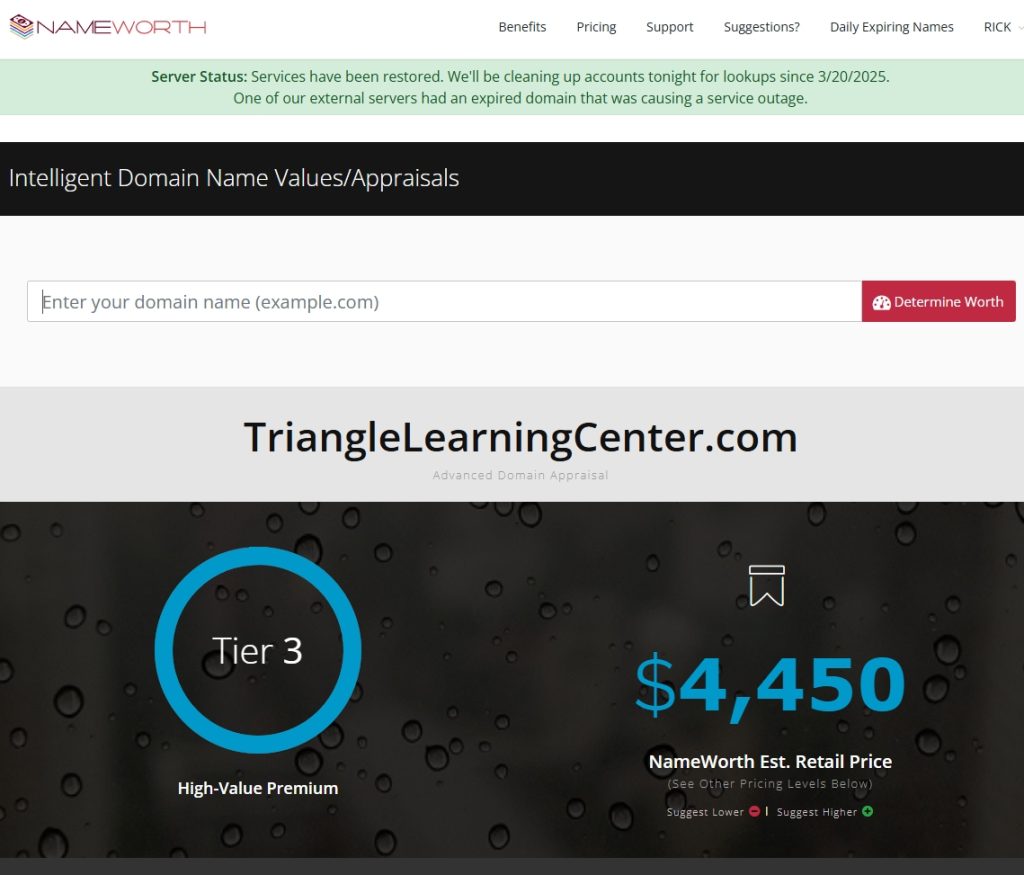 • Valuable domain name with appraisal – Nameworth.com estimated domain name appraisal value:  $4,450.00.  Please see snapshot below.